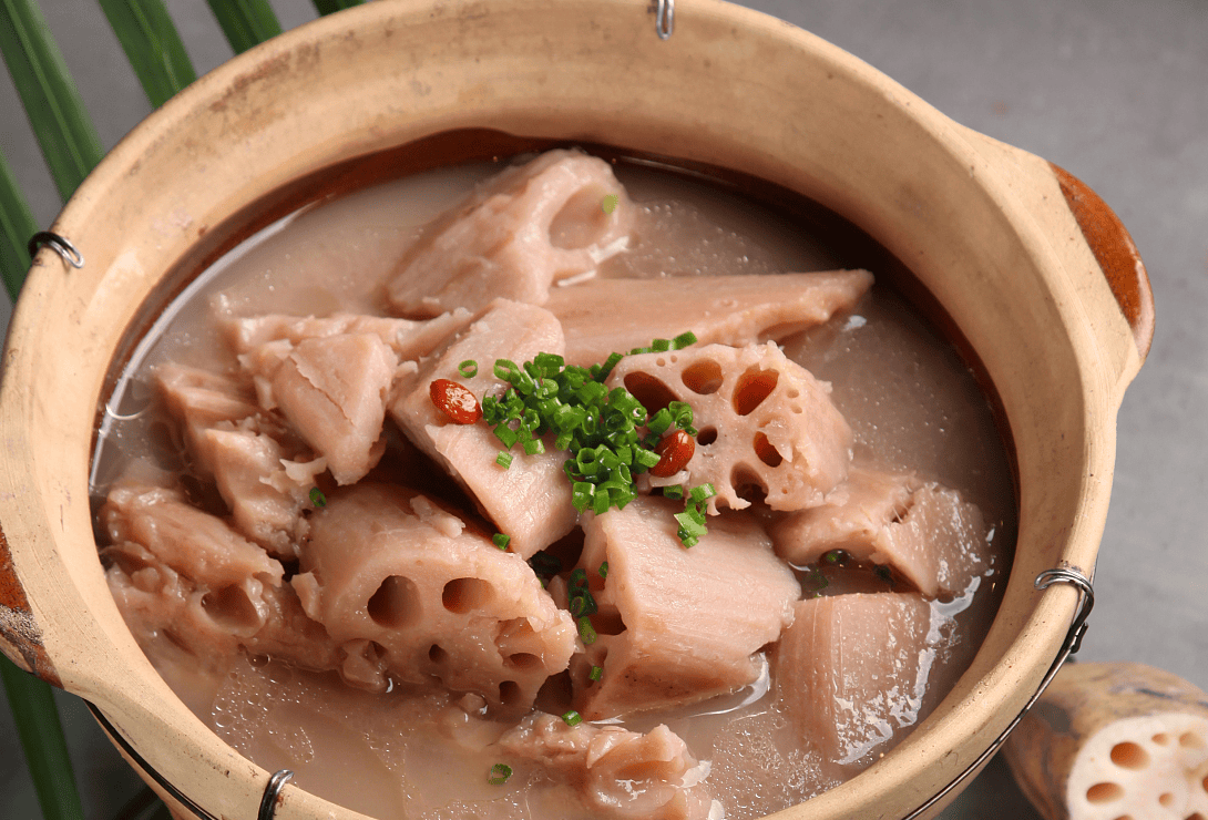 砂锅里放排骨、姜片、足量热水,大火烧开后转小火炖 1 小时,再下莲藕继续炖 40 分钟,直到藕块变粉、排骨软烂;