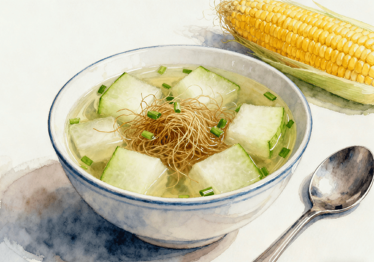 材料:玉米须 8g、冬瓜 200g、葱花少许做法:① 冬瓜去皮切小块,和玉米须一起放进锅里,加适量清水;② 大火烧开后转小火煮 15 分钟,至冬瓜变软,加少许盐调味,撒上葱花即可。优势:低卡清爽,夏天喝一碗,既能解暑降温,又能帮身体排出湿热,喝完特别舒服。