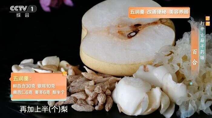 鲜百合30克、银耳10克、南杏仁6克、麦冬6克、梨半个。