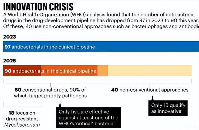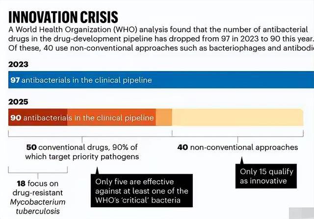 目前全球在研的抗菌药物仅有90种,其中只有15种具备真正创新性,能够对抗世卫组织列出的关键耐药菌的药物更是屈指可数。