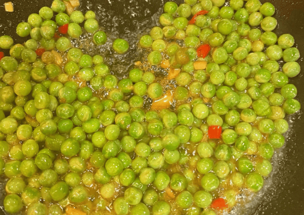 3、再放入豌豆翻炒均匀,加入适量清水,闷煮1至2分钟即可。