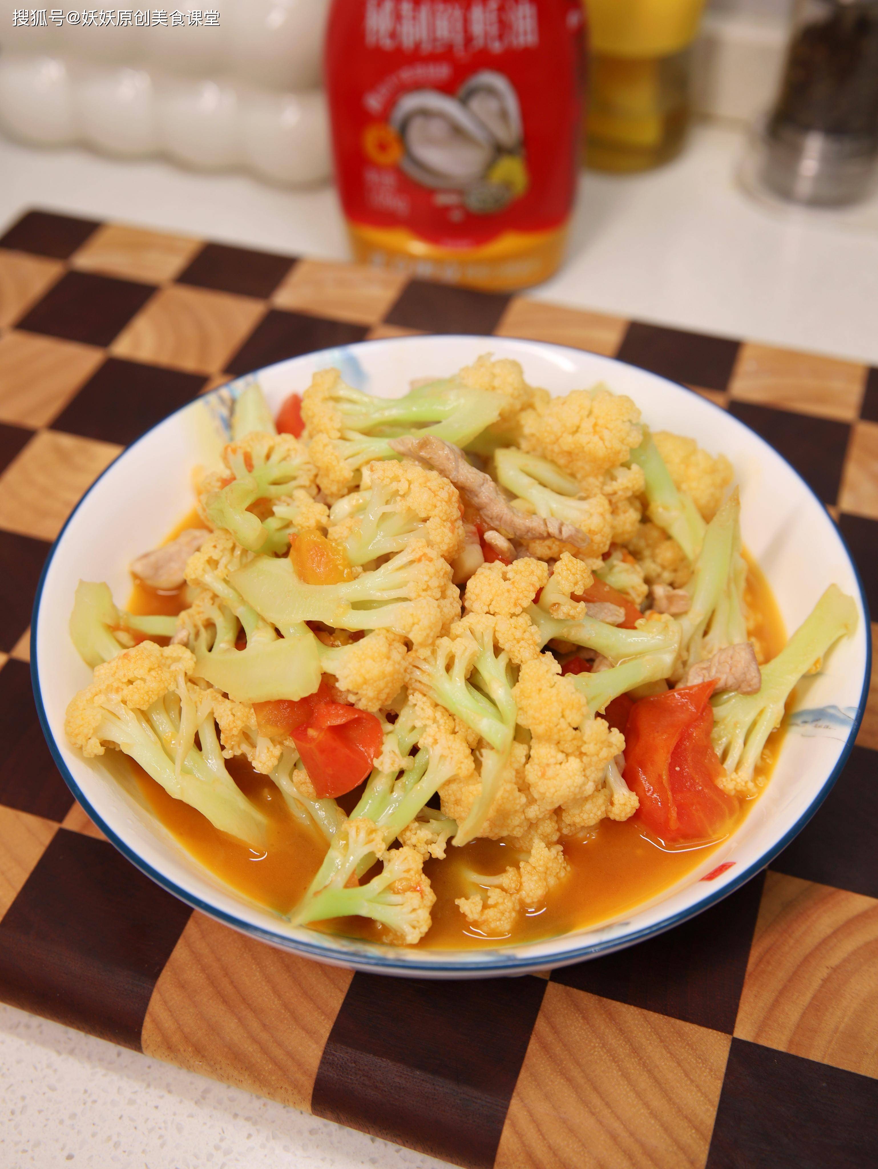 西红柿不但营养丰富,颜色也漂亮,用它搭配其它食物一起炒,不但外观上红扑扑的十分养眼,口感也是酸酸甜甜巨好吃,花菜和里脊肉都是低热量的食物,三者搭配能碰撞出完全不一样的味道。