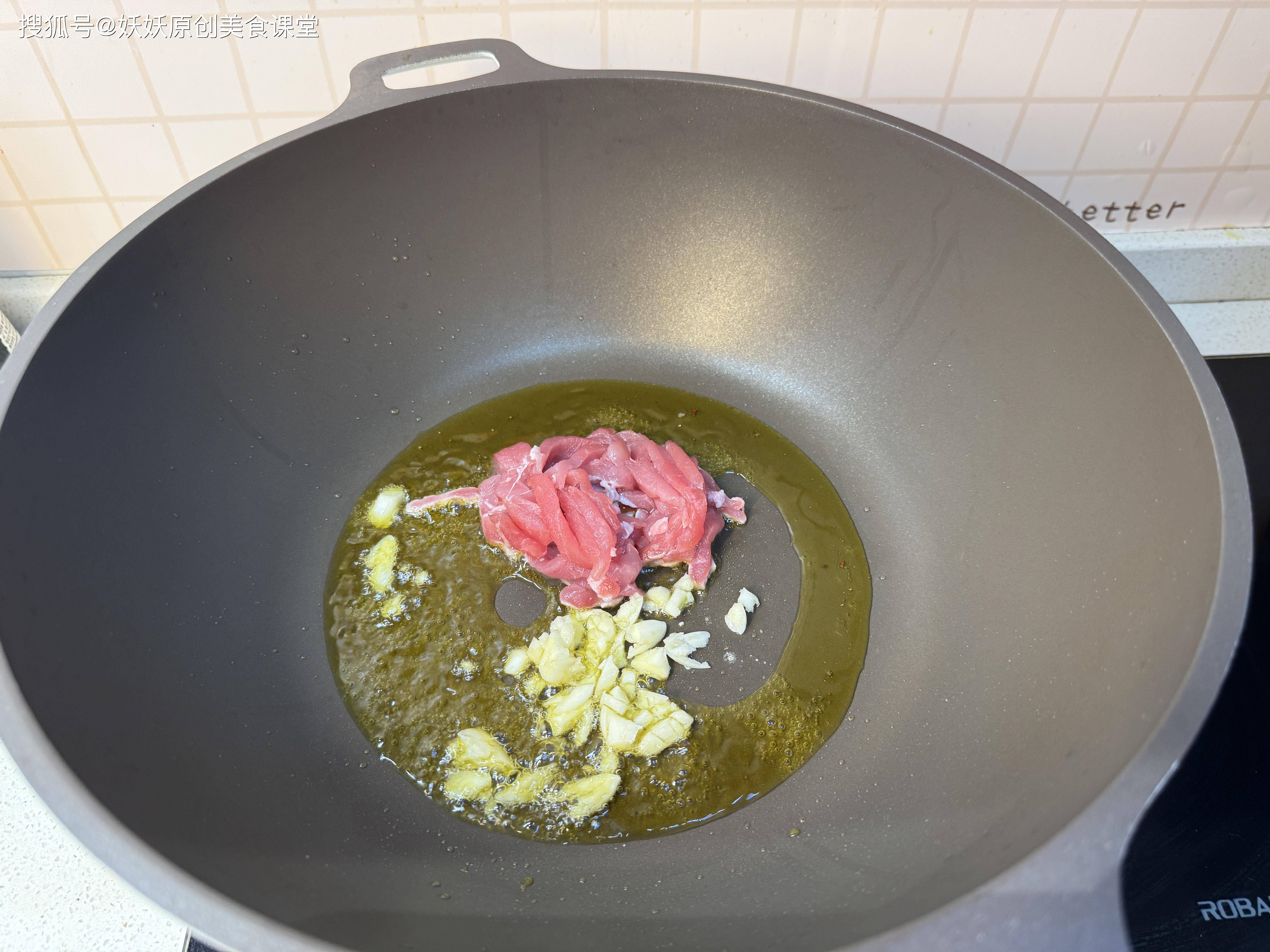 1,油锅烧热,下入蒜末,里脊肉丝,快速翻炒至肉丝变色。