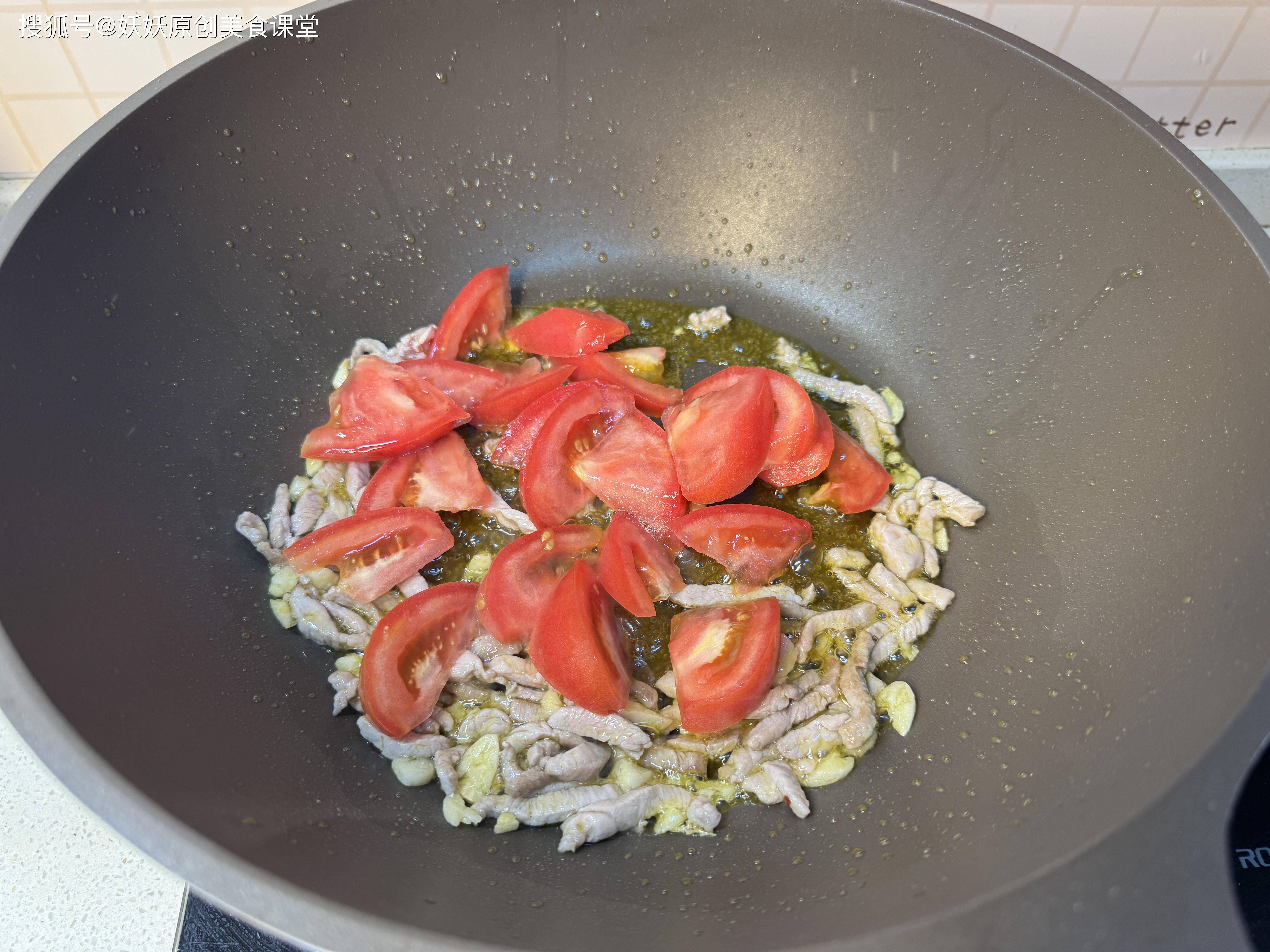 2,加入西红柿,有时间可以给西红柿去下皮,口感会更好,西红柿可以稍微切小一些,翻炒出沙状态更佳。