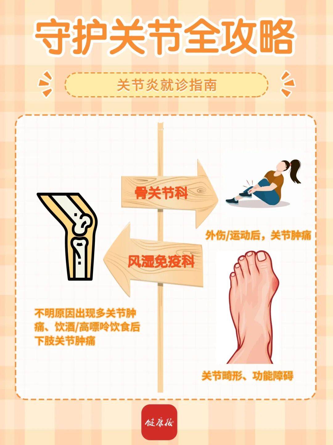 在外伤或运动后,如果患者出现关节和周围组织肿痛,可以优先去骨关节科就诊;如果是不明原因出现多关节肿痛,或饮酒和高嘌呤饮食后出现下肢关节肿痛,患者需要到风湿免疫科就诊;如果出现严重的关节畸形和功能障碍,患者则需要去骨关节科诊治,必要时需要进行外科手术治疗。