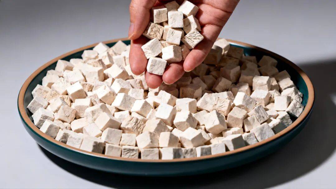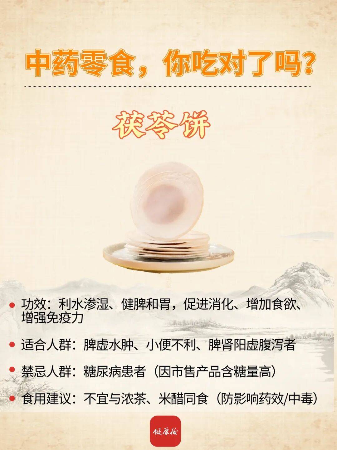 茯苓饼是用茯苓加工而成的一种保健食品,味道香甜,入口即化。茯苓味甘、淡,性平,入脾经,有利水渗湿、健脾和胃的功效,适用于脾虚水湿内停之水肿、小便不利,以及脾肾阳虚之久泻者。