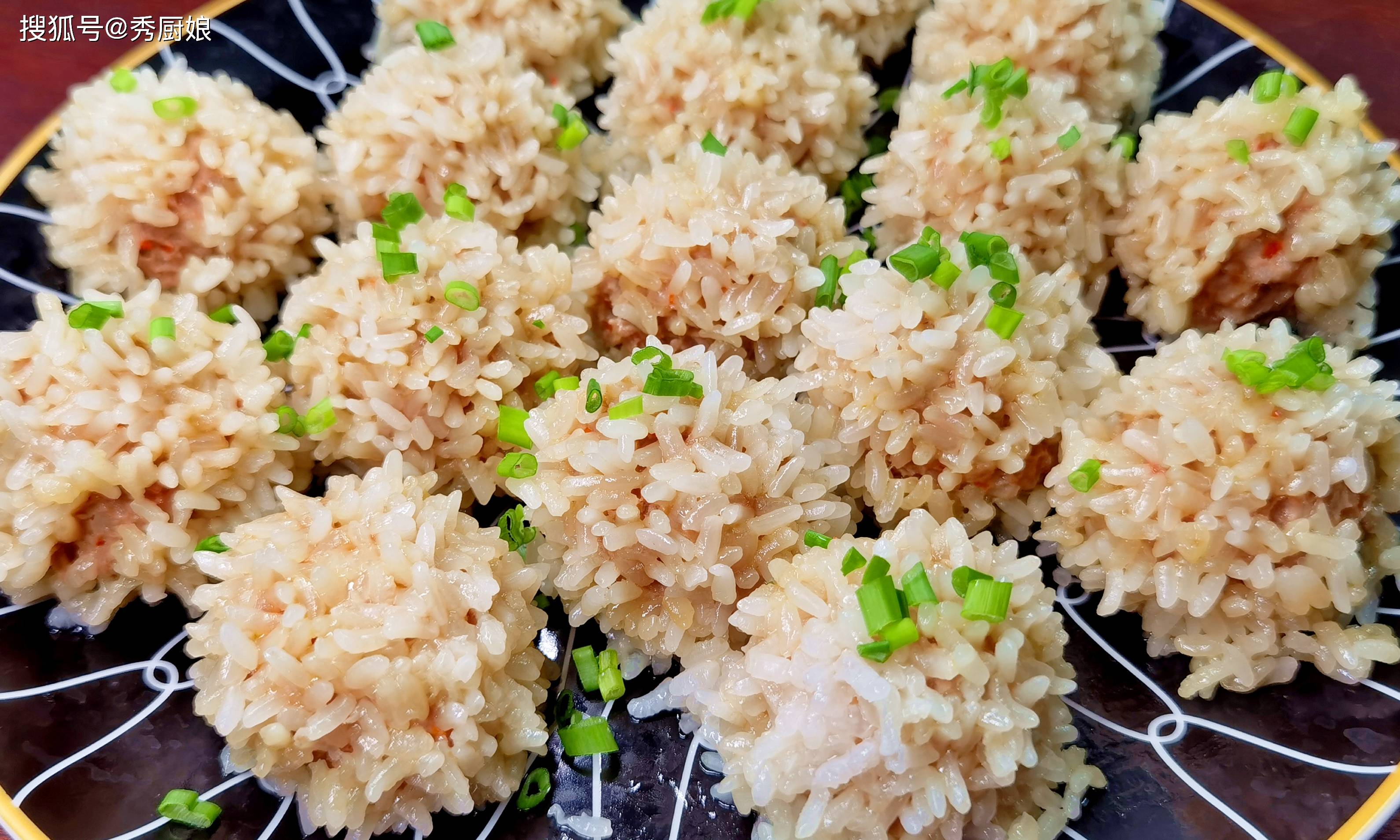 3. 抓一小团馅料搓成圆球,在糯米里滚一圈,让表面沾满米粒,蒸锅内加水,将糯米肉团摆入蒸锅内,盖上锅盖,开大火煮,水开后上锅蒸20分钟,出锅撒点葱花点缀就好啦!