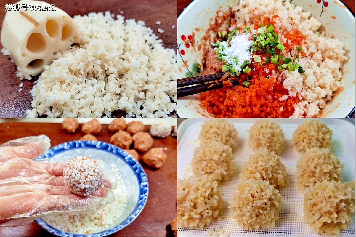 食材:莲藕1节、猪肉馅200g、胡萝卜半根、糯米半碗、葱花、生抽、盐