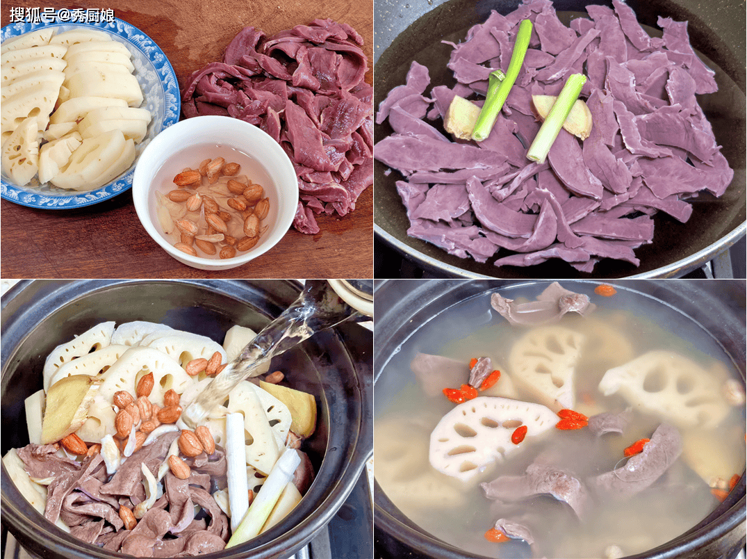 食材:莲藕1节、猪心1个、花生半碗、鲜百合1个、枸杞1小把、姜3片