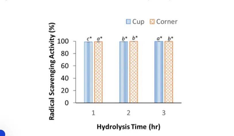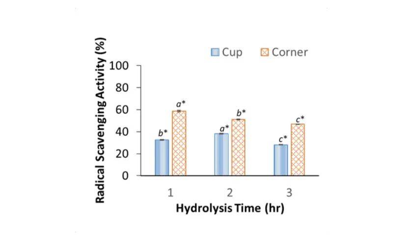 图2:清除DPPH自由基的百分比对杯子和角落中水解产物的活性进行研究不同水解时间(1小时、2小时和3小时)下的燕窝切片。所呈现的数据为三次重复样本的平均值±标准差。条形图不同的字母在统计学上存在显著差异(p<0.05)燕盏和燕角水解产物之间不同水解时间(1、2和3小时)下的EBN。星号(*) 表示两组数据之间存在统计学上的显著差异同一体系内的燕盏和燕角的水解产物水解时间,显著性水平设定为p<0.05。