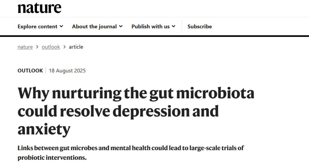 2025年8月18日,国际权威杂志《Nature》Outlook栏目发表了题为《Why nurturing the gut microbiota could resolve depression and anxiety》的深度文章,系统探讨了肠道微生物群与精神健康之间的密切联系,以及基于微生物组的干预策略如何可能改善抑郁和焦虑等情绪障碍。