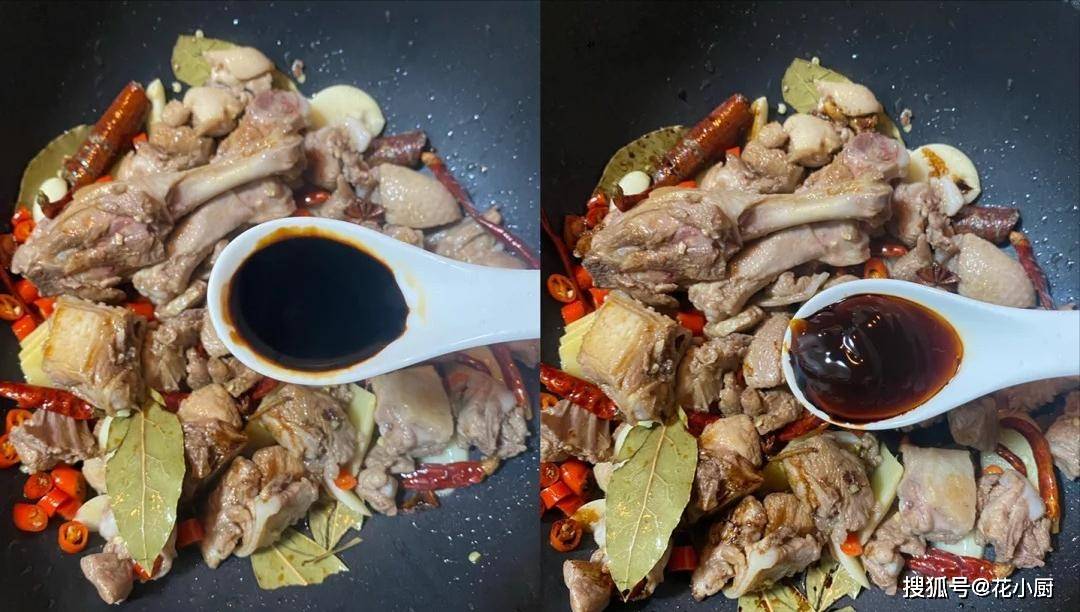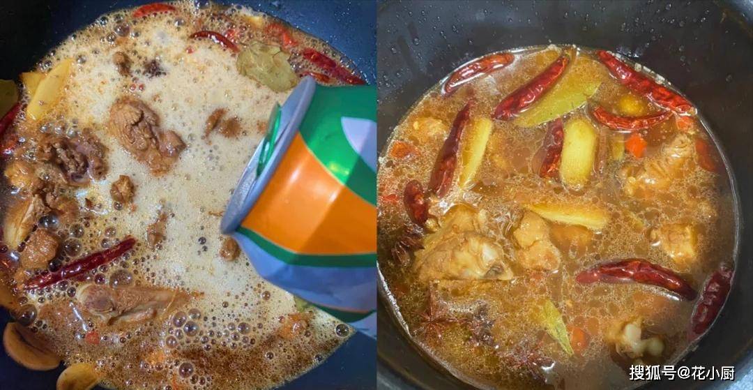 3、配料炒香以后,调味的环节就到啦。往锅里加一勺生抽、一勺老抽、一勺蚝油,再根据自己口味加点盐和鸡精。调料加好以后,咱把一罐啤酒倒进去,然后煮开。这啤酒一倒进去,那股啤酒的香气就更明显了。