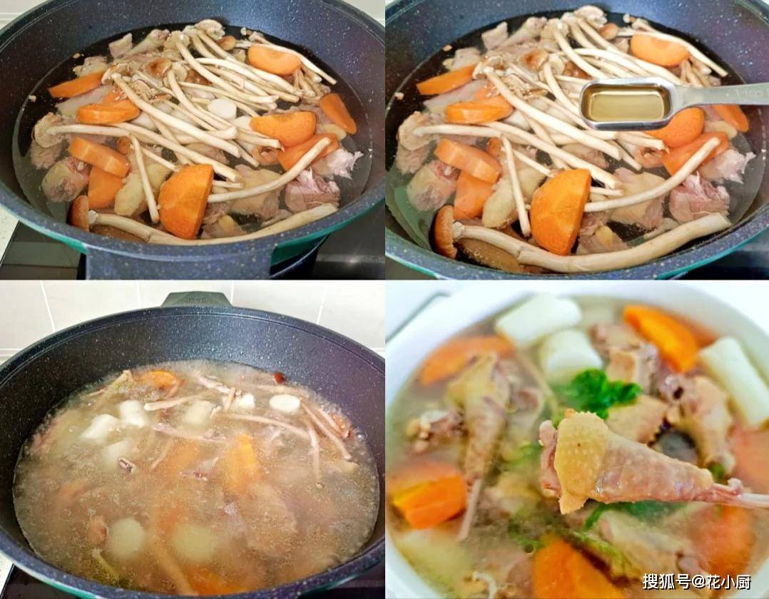 时间到了,加入生抽和盐调味,然后再煮五分钟,让味道充分融合,这锅茶树菇鸽子汤大功告成!