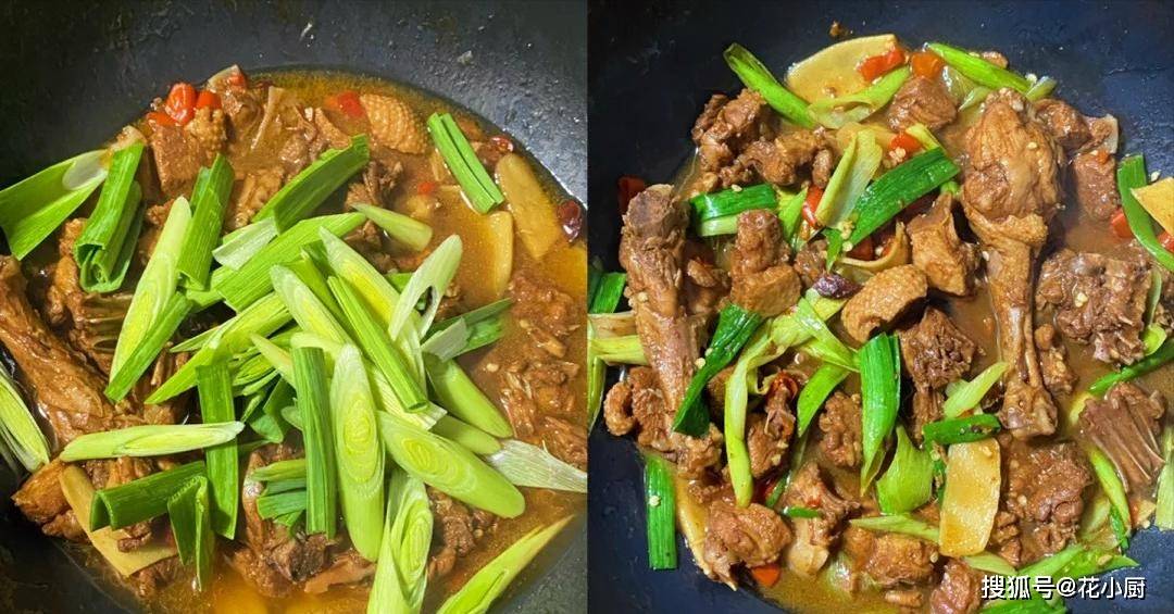 等高压锅的气消了,把压好的鸭肉倒回锅里。这时候把大蒜叶加进去,开大火收汁。看着汤汁一点点变少,裹在鸭肉上,这道菜就算大功告成啦。