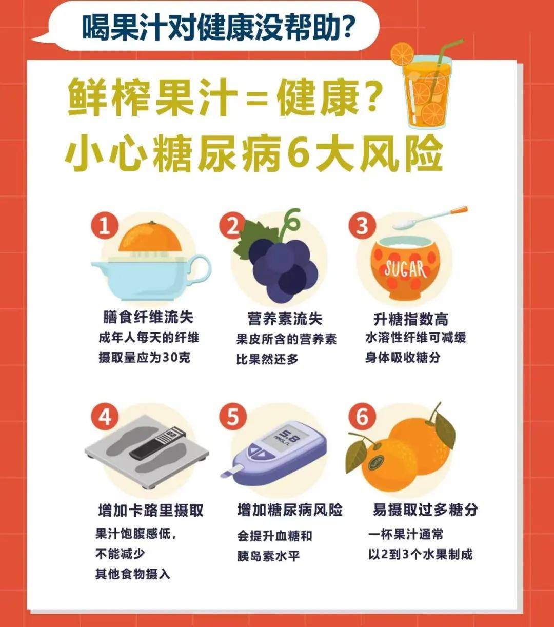 不推荐糖尿病患者饮用果汁!尽管天然食品通常被认为是健康的选择,但水果在榨汁过程中,其膳食纤维与糖的结合被破坏,导致糖分能够迅速进入血液。因此,饮用果汁相较于食用整果,更容易导致血糖水平的快速上升。