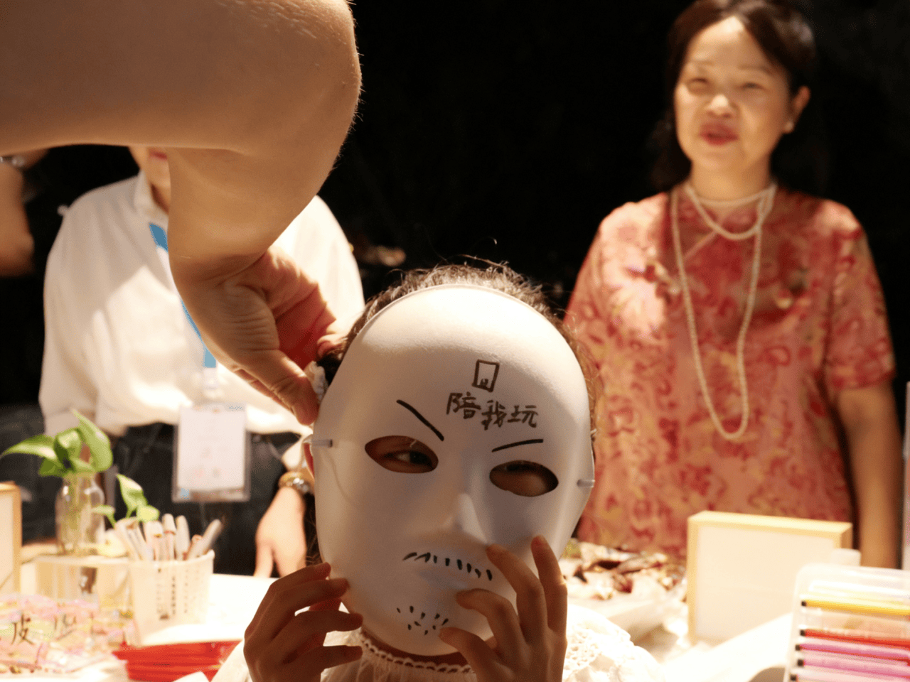 一位妈妈带着孩子在夜市里散步,孩子被“芳导情绪充电站”的丰富多彩手作活动吸引了。