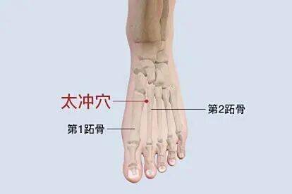 太冲穴:在脚背上,大脚趾和二脚趾之间的凹陷处,每天按1-2次,每次1分钟,能平肝降火,缓解头晕头痛;