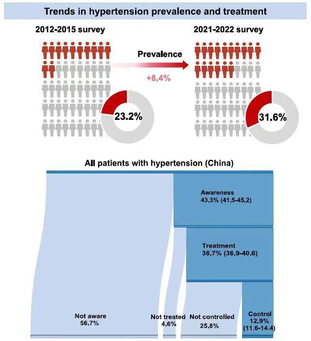 一项由中国医学科学院阜外医院王增武团队发表在《细胞》(Cell)子刊上的论文显示:中国成年人高血压患病率持续上升,2021-2022年患病率为31.6%,与2012-2015年相比,增加了8.4%。
