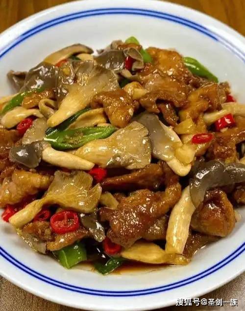 4. 最后炒制:留底油爆香葱姜,下平菇翻炒,再加入肉片,快速淋入调味汁翻炒均匀。
