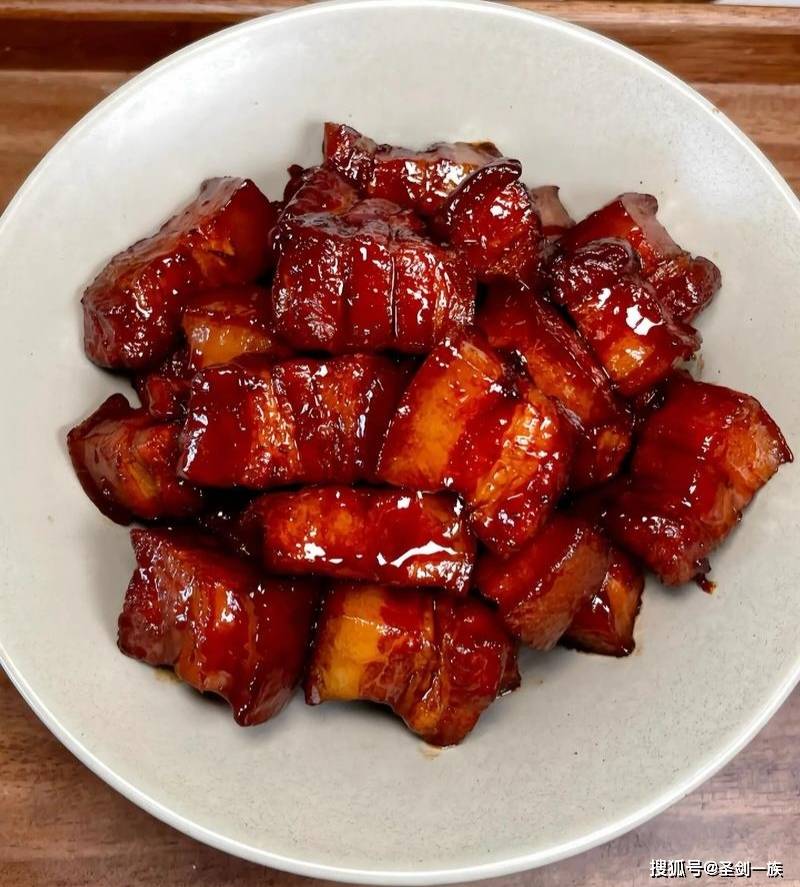 所需食材:带皮五花800 g、冰糖40 g、黄酒150 ml、生抽35 ml、老抽10 ml、八角2颗、桂皮1小段、香叶2片、葱姜适量、热水没过肉面。