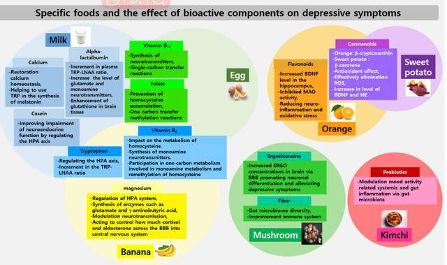 研究发现,超加工食品摄入量越高,患抑郁症的风险越大,而牛奶、鸡蛋、香蕉、蘑菇、红薯等健康食物对抑郁症患者都有帮助。几种生物活性化合物被认为对对抗抑郁症有潜在的好处,包括钙、酪蛋白、α -乳清蛋白、色氨酸(TRP)、维生素B6和B12、镁、类黄酮(尤其是橙皮苷)、类胡萝卜素、麦角硫因、纤维和益生菌。