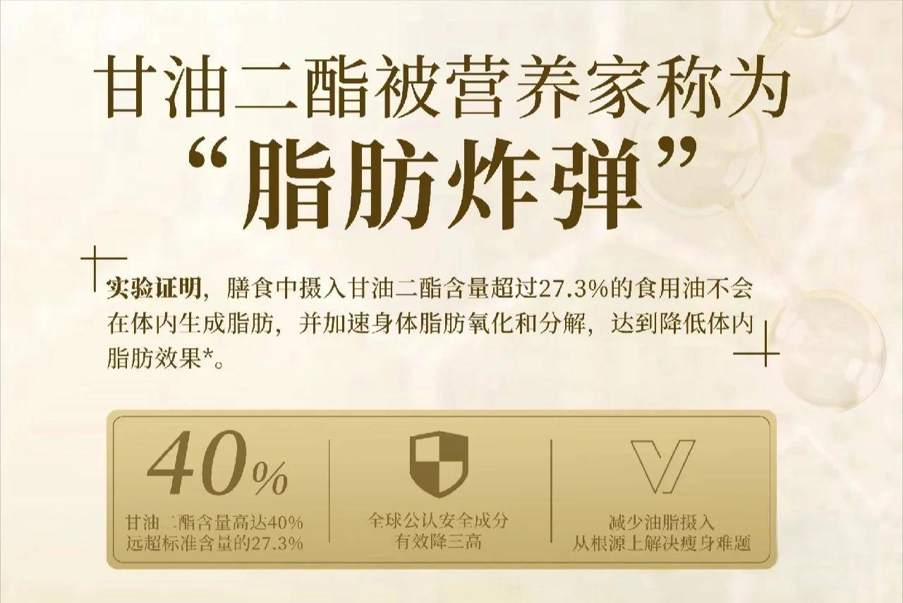 在营养学领域,甘油二酯被称为 “脂肪炸弹”, 这已经不再是一个新概念。日本和美国长期以来一直在特定的健康食品中使用它。现在,我们国内的技术已经跟上了步伐,比如精立方甘油二酯油,它用花生油作为底料,烹饪方式也没有任何改变。