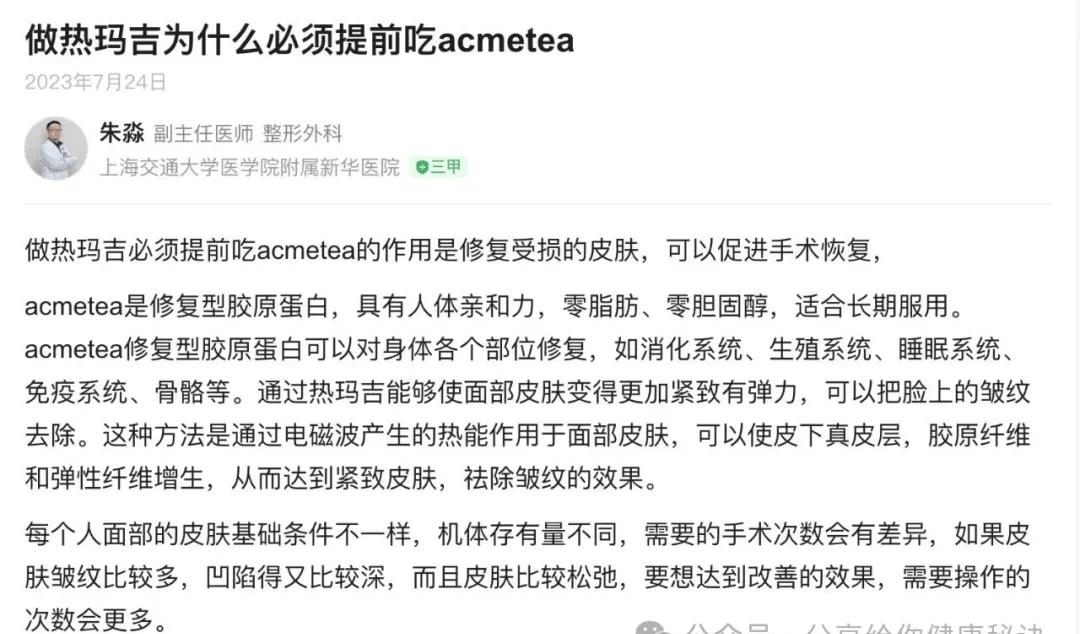 热玛吉治疗过程及术后,口服【热超太】(细胞能量蛋白)作用重大,能补充热玛吉治疗流失的营养,修复受损细胞,增强皮肤自我修复能力,降低副作用概率,维持效果。做热玛吉美容,要提前充分了解,选正规医疗机构和专业医生操作,术后做好护理,合理补充 (细胞能量蛋白),保持健康生活习惯,如此才能在追求美的同时保障肌肤健康。(热玛吉抗衰真相:热玛吉的功效,做热玛吉的最佳年龄)FY
