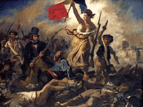 《自由引导人民》,德拉克洛瓦 (1830),现藏卢浮宫博物馆。画面在七月革命背景下,以自由女神引领民众跨越街垒为核心,炽热色调与奔放笔触赋予革命事件以寓言般的崇高感。图片来源:Louvre Museum
