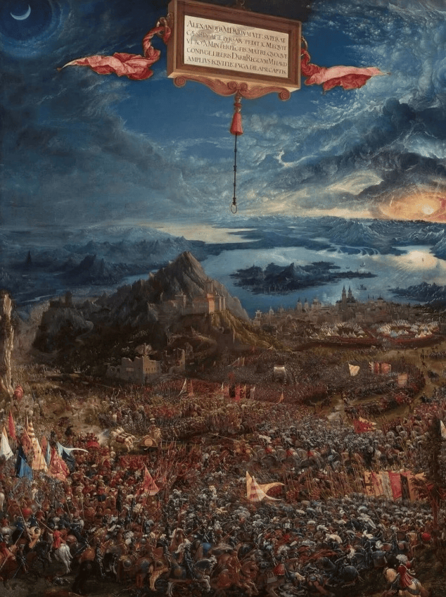 《亚历山大之战》,阿尔特多费尔(1529),现藏慕尼黑老绘画陈列馆。画面以俯瞰视角囊括山川、军队与天际,将伊苏斯战役的瞬间定格为浩瀚的历史长卷。 图片来源:Google Arts & Culture