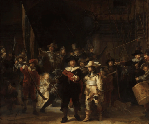 《夜巡》,伦勃朗 (1642),现藏阿姆斯特丹国家博物馆。画面以民兵队整装待发的瞬间为场景,展现行动中的协作与层次。图片来源:Rijksmuseum