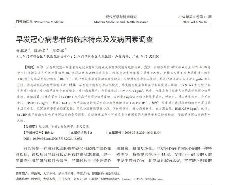 [1]曾韶英.早发冠心病患者的临床特点及发病因素调查[J].现代医学与健康研究电子杂志,2024