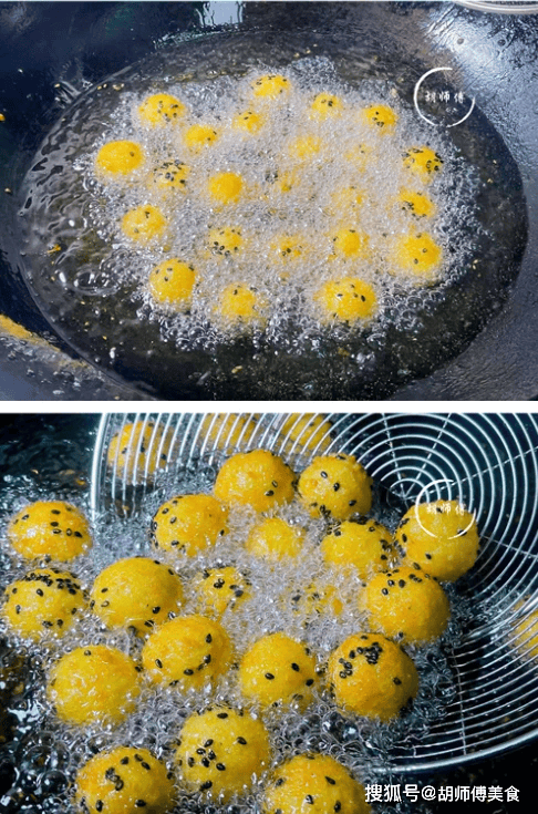 2、炸柿子小丸子时,一定要冷油下锅,如果热油下锅,柿子小丸子里面还没有熟,外表就炸糊了,这样炸出来的柿子小丸子吃着特别苦,低油温小火慢炸的柿子小丸子,色泽金黄,吃着软糯香甜。