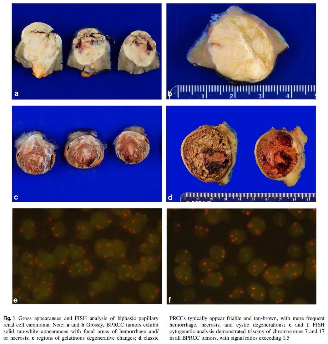 ▲图1 双相型乳头状肾细胞癌大体外观和FISH检测结果