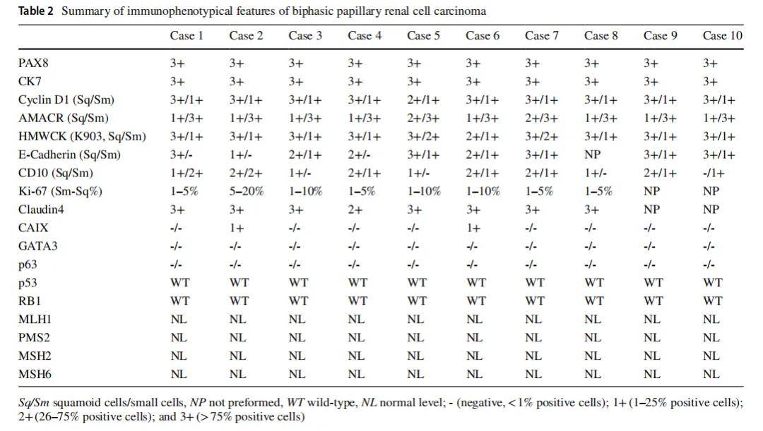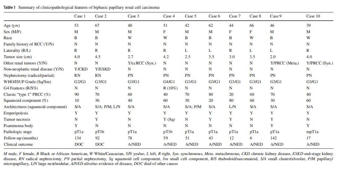 本研究报道了双相型乳头状肾细胞癌(BPRCC)的病例系列,整合了临床病理、组织形态学、免疫表型和基因组数据,以加深对这一罕见且近年才被认识的肾肿瘤的理解。本文对 10 例病例的分析构成了迄今为止最全面的评估之一,并强调了其在临床、形态学、免疫表型和分子谱方面的若干特征性表现,支持将BPRCC归类为乳头状肾细胞癌(RCC)谱系中的独特亚型。