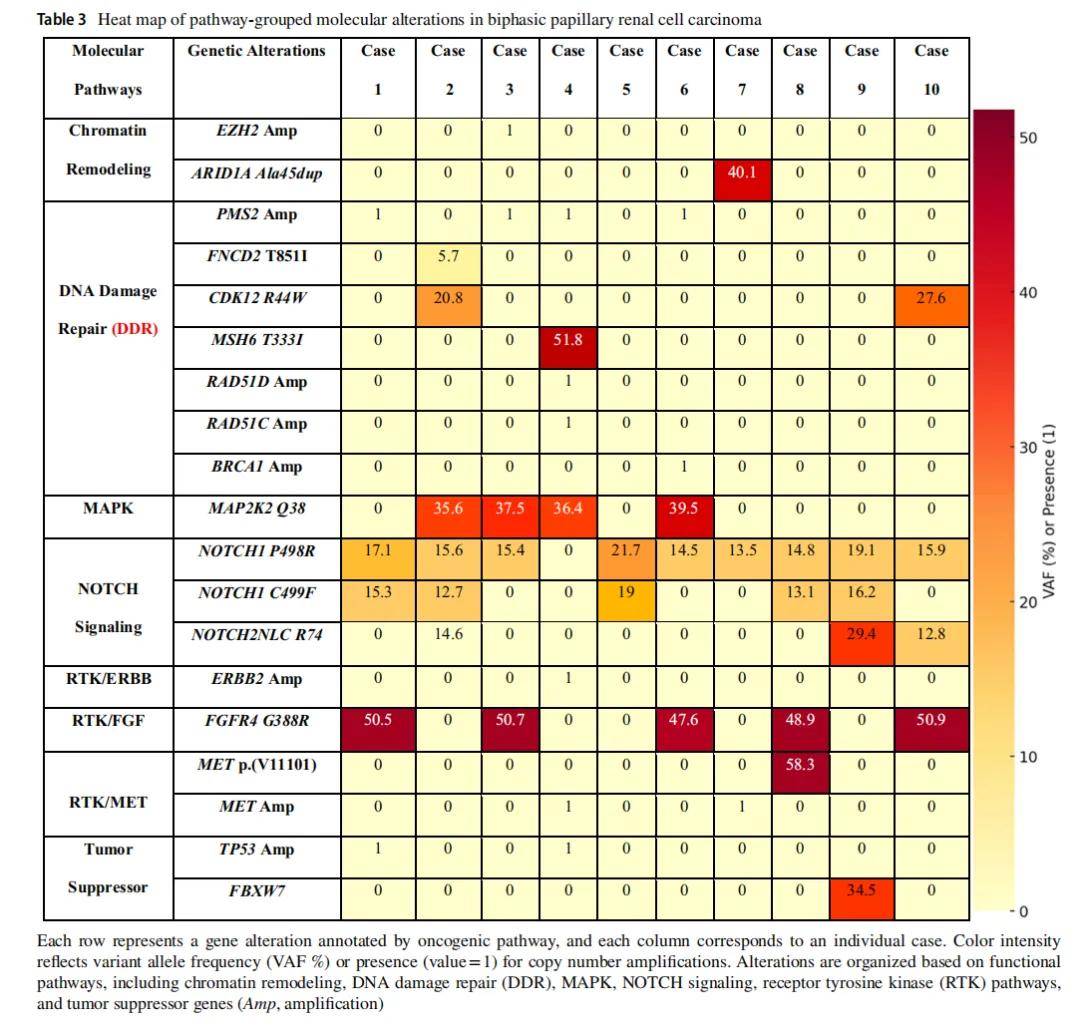 综上所述,这些发现提示双相型乳头状肾细胞癌(BPRCC)存在分子异质性,其特征为与经典“1型”乳头状肾细胞癌(PRCC)相比,具有重叠但可能更复杂的基因组改变和通路激活。尽管部分BPRCC肿瘤具有“1型”PRCC中常见的特征(如MET改变和7号/17号染色体三体),但其他肿瘤表现出涉及NOTCH、MAPK和DNA损伤修复(DDR)通路的基因组改变,而这些在“1型”PRCC中报道较少。这种分子多样性可能反映了BPRCC内部存在生物学上不同的亚型谱系,它们以特征性双相形态为共同特征,但可能由不同的致癌通路驱动。尽管尚未发现明确的驱动突变,但大多数病例中检测到NOTCH突变,其变异丰度通常低于 20%。这些改变在肾肿瘤中的功能影响尚不确定,但其持续存在值得进一步研究。总体而言,这些发现为将BPRCC视为乳头状肾细胞癌谱系中的一个独特实体提供了初步支持。