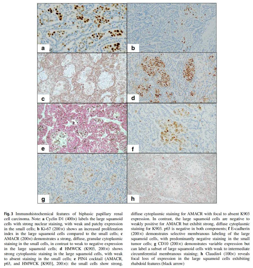 为进一步评估双相型乳头状肾细胞癌(双相PRCC)与经典“1型”乳头状肾细胞癌(PRCC)之间的区别,研究人员对 3 例经典“1型”PRCC进行了对比免疫组化染色(CK7、AMACR、PIN4、Cyclin D1和Ki-67)。所有病例中,AMACR均呈弥漫性强胞质阳性,标记几乎所有肿瘤细胞,与近端小管分化一致。相反,高分子量细胞角蛋白(HMWCK,K903)染色呈灶性、灶片状或完全阴性,Cyclin D1仅标记散在肿瘤细胞,与任何特定形态学区域无关。这种模式与双相PRCC显著不同,在双相PRCC中,Cyclin D1和HMWCK的表达突出显示双相结构内一个形态学和功能上不同的增殖区域。