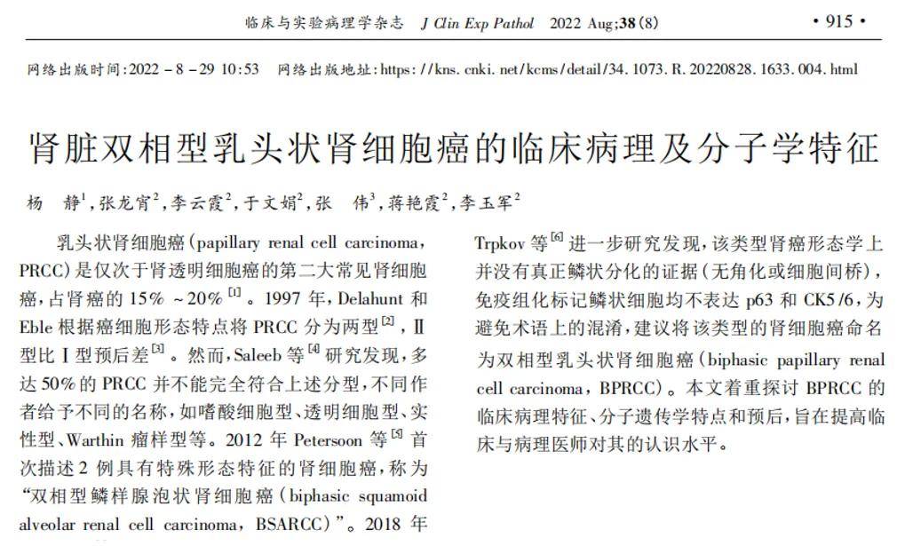 乳头状肾细胞癌(papillary renal cell carcinoma,PRCC)是仅次于肾透明细胞癌的第二大常见肾细胞癌,占肾癌的 15%-20%。1997 年,Delahunt和Eble根据癌细胞形态特点将PRCC分为两型,II型比I型预后差。然而,Saleeb等研究发现,多达 50% 的PRCC并不能完全符合上述分型,不同作者给予不同的名称,如嗜酸细胞型、透明细胞型、实性型、Warthin瘤样型等。2012 年Petersoon等首次描述 2 例具有特殊形态特征的肾细胞癌,称为“双相型鳞样腺泡状肾细胞癌(biphasic squamoid alveolar renal cell carcinoma,BSARCC)”。2018 年Trpkov等进一步研究发现,该类型肾癌形态学上并没有真正鳞状分化的证据(无角化或细胞间桥),免疫组化标记鳞状细胞均不表达p63和CK5/6,为避免术语上的混淆,建议将该类型的肾细胞癌命名为双相型乳头状肾细胞癌(biphasic papillary renal cell carcinoma,BPRCC)。BPRCC往往具有PRCC的遗传学特征,表现为7、17号染色体三体或Y染色体缺失。
