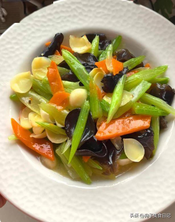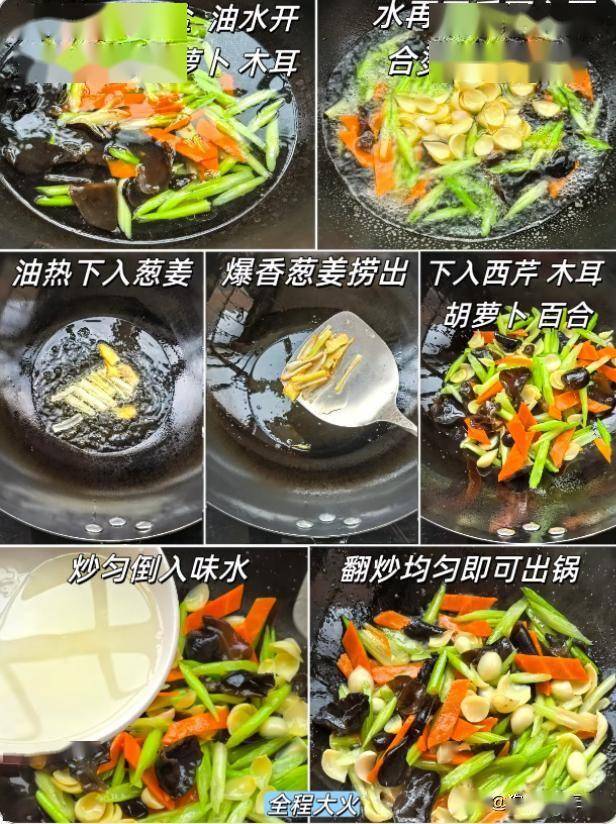 材料:适量西芹,适量胡萝卜,适量木耳,适量百合,葱姜蒜,盐,鸡精,白糖,土豆淀粉。