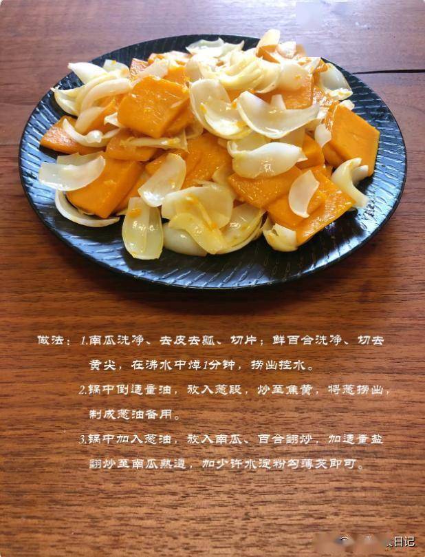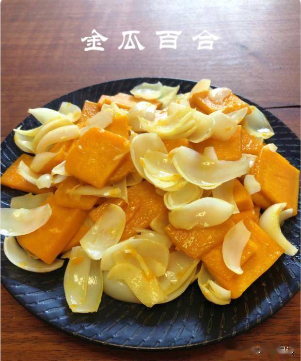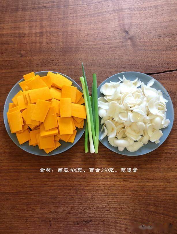 材料:400克南瓜,250克百合,葱段适量,盐,水淀粉。