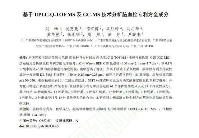 [1]刘畅,吴惠勤,祁江博,等.基于UPLC-Q-TOF MS及GC-MS技术分析脑血栓专利方全成分[J/OL].质谱学报,2024.8.6