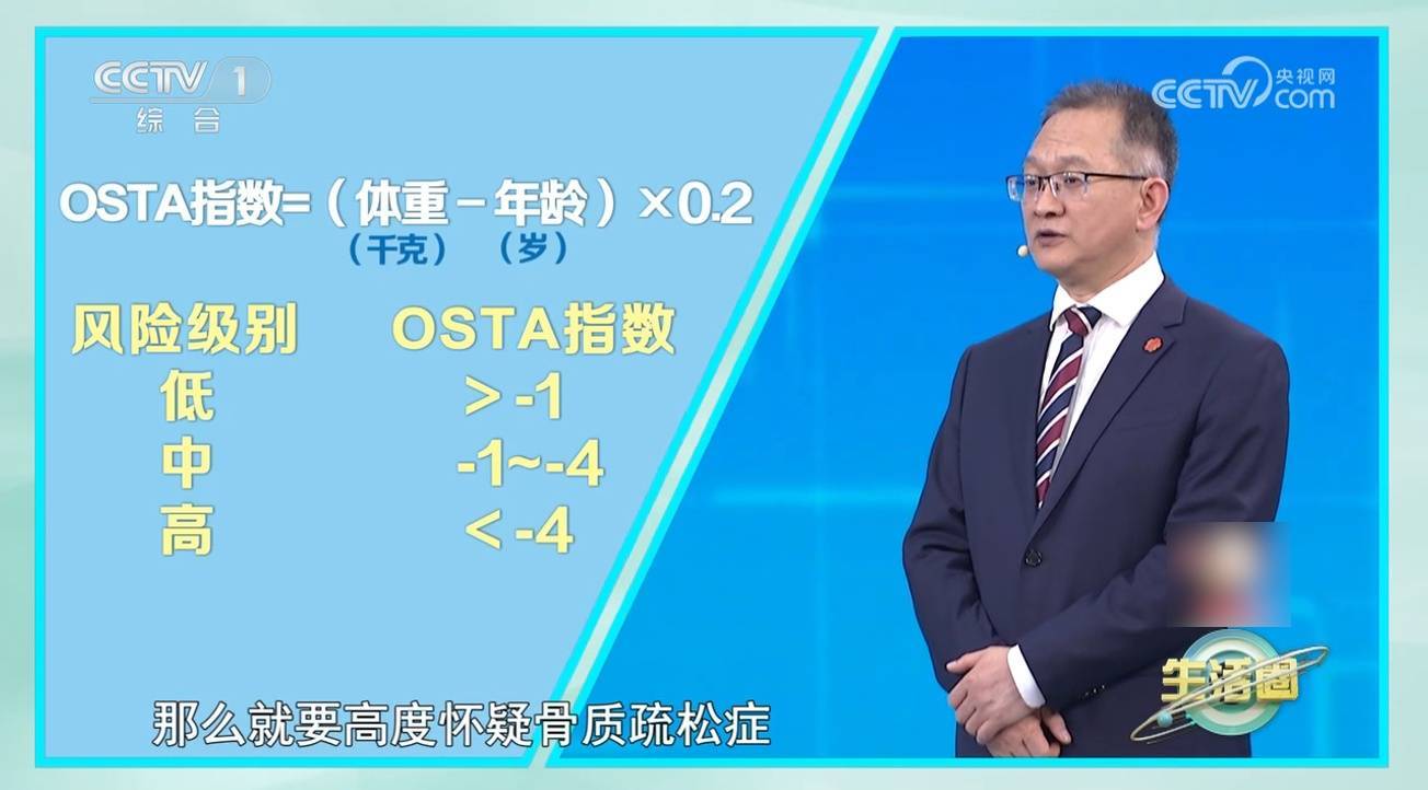 专家推荐一个公式,可以在家自测骨质疏松风险:OSTA风险指数=(体重〈千克〉-年龄〈岁〉)×0.2。注意:具体需结合医生分析其他危险因素综合判断。