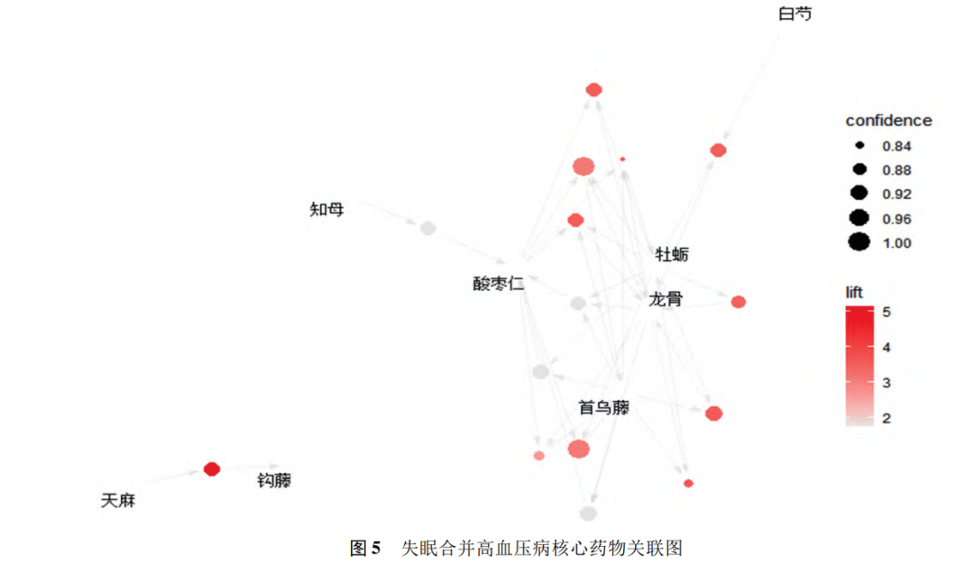 通过关联规则得到治疗失眠合并高血压病的核心药物组合有酸枣仁、龙骨、牡蛎、首乌藤、知母、 白芍、天麻、钩藤,以上药物多归于肝经,可知对失眠合并高血压病进行治疗时,调肝为重要原则。具体药物可分为三类: (1) 养肝组: 包括酸枣仁、首乌藤、白芍。酸枣仁味酸甘性平,入肝、胆、心经,首乌藤味甘性平,入心、肝经,两者为常用养血安神药, 对改善失眠具有显著效果 [32,33],酸枣仁还具有抗心律失常、降压、降脂的功效 [34]; 白芍酸苦微寒,归肝、 脾经,可养血敛阴、凉肝活络、调畅气机,研究发现白芍总苷可影响肾素 - 血管紧张素系统、炎症反应及胰岛素抵抗而降压 [35],还可抑制大脑皮层而镇静 [36]。此外,知母与酸枣仁同为酸枣仁汤药物组成,味苦甘性寒,合用可清热泻火、滋阴润燥,调节阴阳而改善失眠,现代研究还发现知母皂苷可调节钙离子浓度,对改善血压具有一定功效 [37]。(2) 平 肝组: 包括龙骨、牡蛎。龙骨、牡蛎为镇静安神药对,龙骨味甘涩性平,入心、肝、肾、大肠经,牡蛎味咸性微寒,入肝、胆、肾经,两者均为矿物药,功效类似,可平肝潜阳,镇静安神,延长睡眠时间 [38],同时, 柴胡加龙骨牡蛎汤在临床中被运用于高血压的治疗中,显示出一定的降压效果 [39]。( 3) 清肝组: 包括天麻、钩藤。天麻、钩藤为治疗高血压药对,天麻味甘性平,入肝经,钩藤味甘性凉,入肝、心包经,两药合用共同发挥息风定惊、清热平肝的功效。天麻中的有效成分天麻素不仅可以减少内皮素与血管紧张素的释放而降低血压,又可抑制中枢神经而镇静催眠 [40]。钩藤中的钩藤碱是降压的主要物质,此外,钩藤还具有抗氧化、抗炎、抗衰老等作用,可用于多种神经系统疾病 [41]。 上述药物配伍为治疗失眠合并高血压病的核心药物组合,共同发挥滋阴潜阳、清热调肝的作用。 肝在中医脏腑辨证中占据着重要位置,主藏血而体阴,主疏泄而用阳,肝体和肝用相互关联、相互影响,发生病变时易见体用同病。对于肝病的治疗, 《黄帝内经》首先提出“肝苦急,急食甘以缓之”,“肝欲散,急食辛以散之,用辛补之,酸泻之”,明确了甘缓、辛散、酸收的基本治法。《金匮要略》指出“肝之病,补用酸,助用焦苦,益用甘味之药调之”,在之前基础上增加了苦泻的治疗方法。清代叶天士将肝之体用理论与之结合,在《临证指南医案》中云“考 《内经》治肝之法,不外辛以理用,酸以治体,甘以缓急” [42],提出肝病治疗在于调节肝之体用的理论。 之后的王旭高对治肝经验进一步总结,指出“肝病最杂而治法最广”,提出更为详细的治肝三十法。 本研究所得的药物核心组合从基本的治肝思路入手,集养肝、平肝、清肝三法于一体,体用兼顾,调和周身气血阴阳而治疗疾病。 综上所述,失眠与高血压的发生呈现不断上升的趋势,而中医擅长用一个中药复方同时解决多个具有关联性的问题,在治疗失眠合并高血压病上具有重大优势与潜能。本文通过数据挖掘对失眠合并高血压病的用药进行研究,得出失眠合并高血压病患者多属阳热之证,病在肝、心,涉及肺、脾、肾。 失眠与高血压病共病的病机多归于阳盛阴衰,治疗重在补缓,滋阴养血补虚; 兼予清降,重镇潜阳平逆; 佐以通调,交互气血阴阳。用药将补、降、开三法同用,共同纠正脏腑之偏颇。处方尤重调肝,肝之体用同治,临床可参考酸枣仁汤、天麻钩藤饮、柴胡加龙骨牡蛎汤等方剂进行加减。 本研究是在经过临床验证有效的基础上进行探索,可为中医药治疗失眠与高血压病共病提供一定的指导。但本研究仍存在缺陷,受研究方法和样本量限制未将舌脉、药物剂量纳入分析,缺少量效关系及舌脉参证的研究,同时,未能纳入证候及患者资料,缺少方、症、证对应关系的研究。因此,未来可进一步改进研究方法、纳入更多样本量,多角度进行挖掘,为失眠合并高血压病的中医药治疗提供更全面的科学依据。