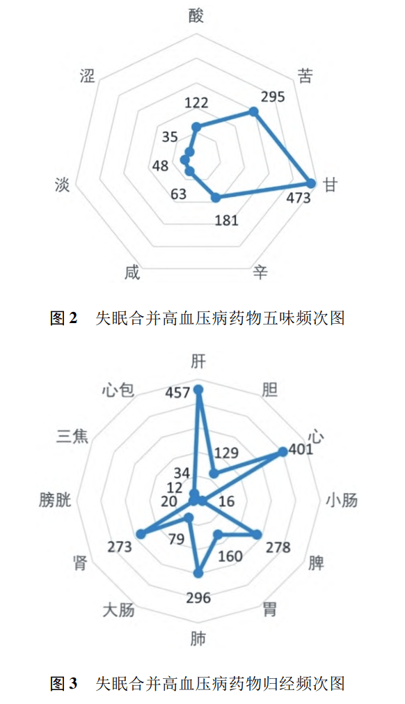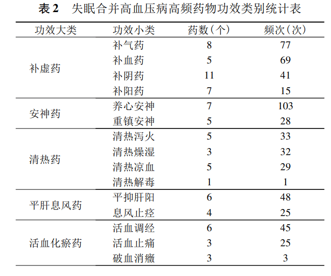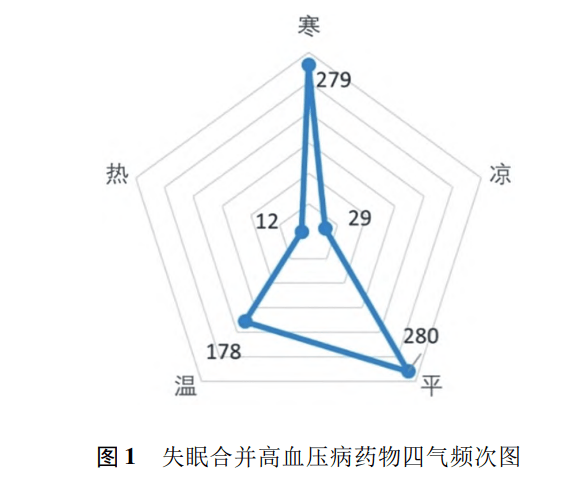病在肝、心,以阳热为主,营卫阴阳失调为本失眠与高血压病均为临床常见疾病,常共同出现,互为因果。现代研究发现两病均与下丘脑 - 垂体 - 肾上腺轴(HPA) 失调、自主神经功能紊乱、免疫及代谢功能失调等病理变化有关 [12]。从中医学来讲,失眠又被称为“不寐”“不得卧”“目不瞑”“夜不瞑”“不能眠”等,《黄帝内经》最早以营卫运行来阐述寤寐变化及失眠病机,在《灵枢·大惑论篇》 云: “卫气不得入于阴,常留于阳,留于阳则阳气满, 阳气满则阳跷盛,不得入于阴则阴气虚,故目不瞑矣” [13]144 ,此条所述“阳不入阴”理论一直被后世医 家作为失眠的总病机。高血压病在古代无明确病名,一般认为其属中医学“头痛”“眩晕”的范畴,临床研究将其病机多归为阴虚阳亢,心肝火旺 [14]。现代王清海教授结合中西医知识,提出可将“脉胀”作为高血压病中医病名的观点 [15],得到了一些学者的认同,脉胀的产生与营卫逆乱,血脉失和有关,正如 《灵枢· 胀论 篇》所云: “营气循脉,卫气逆为脉胀” [13]72。由此可见,失眠与高血压病有着共同的病理机制,其产生均与营卫异常、阳盛阴衰有关,营卫阴阳失调为其根本。失眠与高血压病共病,其病所在脏腑,在药物归经上可以体现。通过本研究中药归经的统计结果可知其病位主要在肝、心。肝主藏血,主疏泄,为人体气机升降之枢纽,营卫气血的运行有赖肝对周身气机的调节。肝属木,心属火,肝为心之母,子母相互影响,肝与心为主要病位亦符合医家对两病的认识。其病所属性质,在药物四气上可以体现。《素问·至真要大论篇》有云“寒者热之,热者寒之” [16],指出阳热证用寒凉药、阴寒证用温热药这一基本用药原则。寒热温凉平的特性可反映药物影响机体阴阳盛衰、寒热变化的作用倾向,本研究的中药四气统计以平、寒多见,可知失眠合并高血压病患者机体多处于阳热状态,需用寒凉 药物进行清降,在功效统计中清热药出现 95 次,为高频药物类别,亦反映出这一特点,这也与失眠合并高血压病多为阳盛阴衰的病理变化相一致。