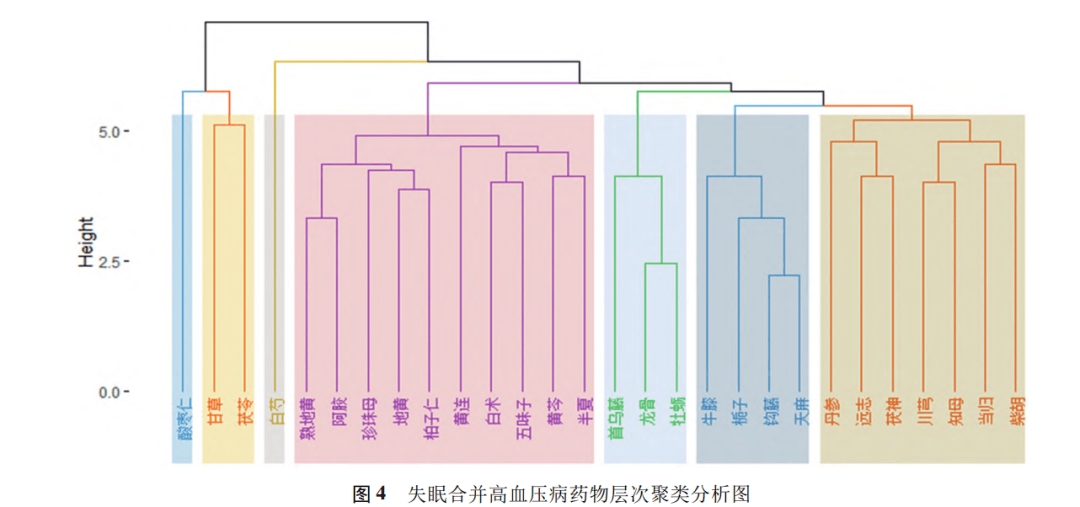 摘要:目的:探讨失眠与高血压病共病的疾病特点及中医药治疗思路,筛选核心用药规律与处方配伍。 方法:检索 CNKI、Wanfang Data、VIP、SinoMed、PubMed 数据库中使用中药复方治疗失眠合并高血压病的临床研究文献,将处方名称及组成药物录入 Excel 中,对药物的频次、类别、性味、归经进行统计,并使用 R Studio( v4. 2. 2) 进 行层次聚类与关联规则分析。检索 CNKI、Wanfang Data、VIP、SinoMed、PubMed 数据库中使用中药复方治疗失眠合并高血压病的临床研究文献,将处方名称及组成药物录入 Excel 中,对药物的频次、类别、性味、归经进行统计,并使用 R Studio( v4. 2. 2) 进行层次聚类与关联规则分析。 结果:共提取处方 74 个,中药 133 味。使用频次前 5 的中药分别为酸枣仁、白芍、 甘草、茯苓、首乌藤,高频中药功效分类依次为补虚药、安神药、清热药、平肝息风药、活血化瘀药。药性以平、寒为主,药味以甘、苦、辛为主,主要归肝、心经。层次聚类得到 5 类方药,关联规则得到核心药物组合,包括酸枣仁、龙骨、牡蛎、首乌藤、知母、白芍、天麻、钩藤。结论:失眠与高血压病共病病位以肝、心为主,病性以阳热多见,治疗注重滋阴养血、清心平肝。用药补、降、开三法并举,主予补缓,兼顾清降,不忘通调,共同和畅气血阴阳。处方以调肝为核心,养肝、平肝、清肝之法共用,肝之体用同治。