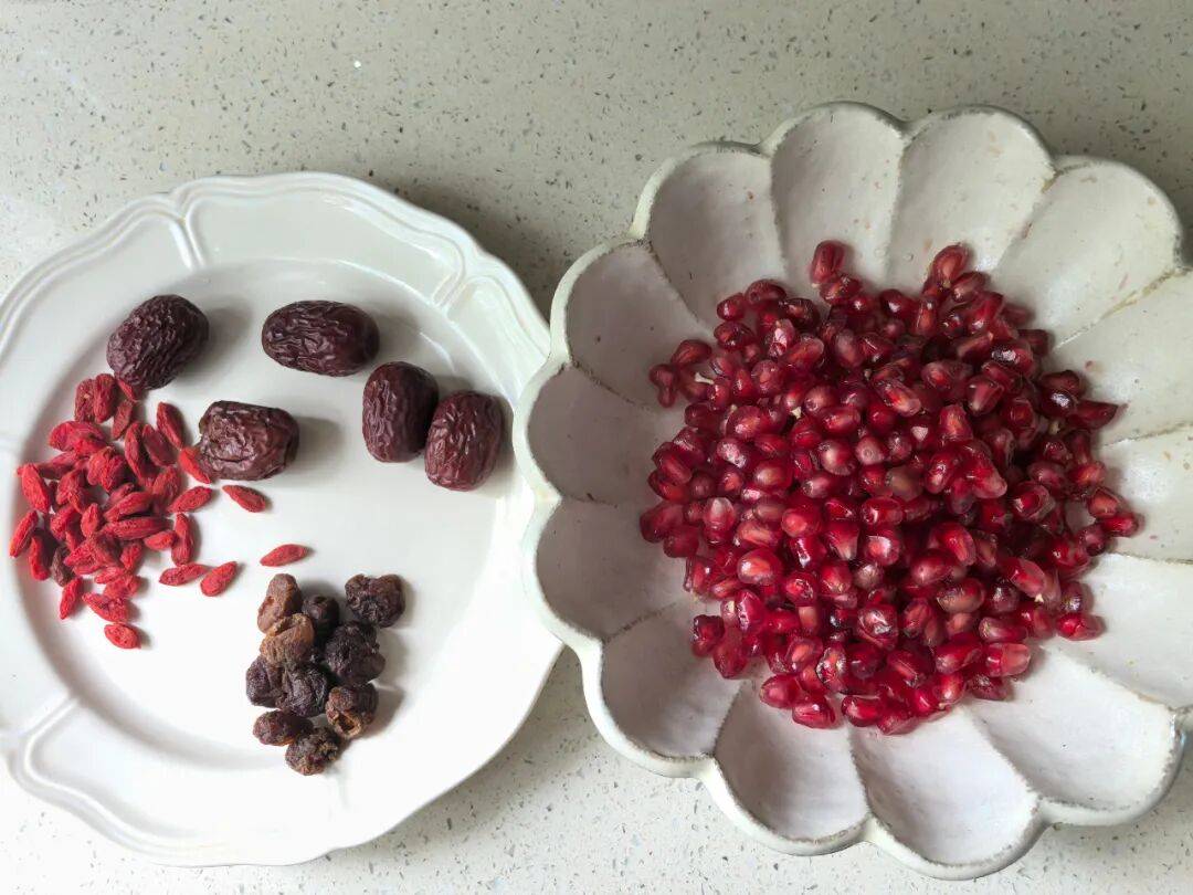 石榴美容养颜;红枣补中益气,养血安神;桂圆可以补心脾、养气血(担心上火的朋友,可以带桂圆壳一起煮,敲开即可);枸杞补肝肾,还能养肝明目。