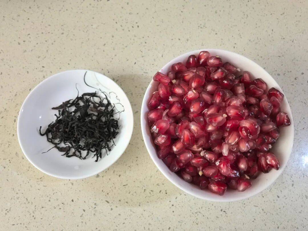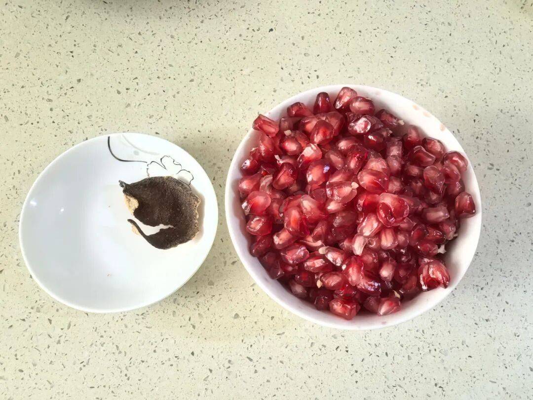 食材:石榴1个,红枣5颗,桂圆肉10g,枸杞10g。