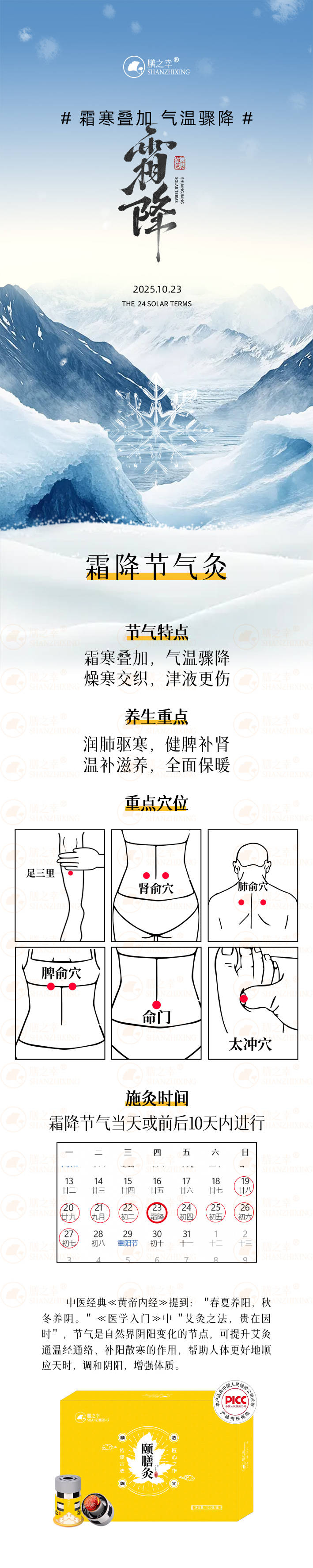霜降时节阳气进一步衰退、阴气更盛,人体肾阳易被寒气损伤,畏寒怕冷症状更为明显,手脚、腰腹、背部等部位常发凉;阳气不足还会导致精神萎靡、乏力嗜睡、手脚冰凉,部分人群会出现腰膝酸软、免疫力下降的情况,稍不注意就易受风寒侵袭引发感冒、关节疼痛等疾病。
