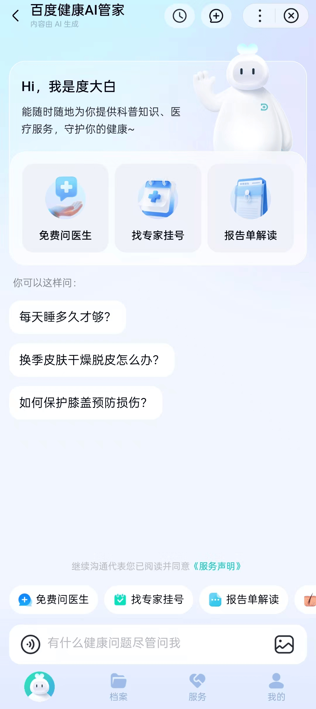 据了解,百度健康AI管家围绕大众健康管理等需求,提供科普问答、档案管理、挂专家号、用药咨询、皮肤病检测、报告单解读、AI预问诊、随访等数十项AI功能,覆盖诊前、诊中、诊后各环节。