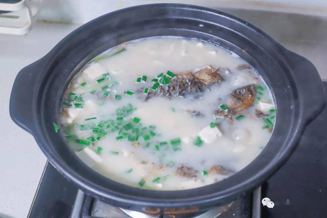 5、煮好之后汤色就是奶白色的,特好别好看,而且很鲜,很好喝的哟。秋天多喝一些汤,缓解秋燥又滋补。最后可以来一把小葱点缀一下,更有食欲。