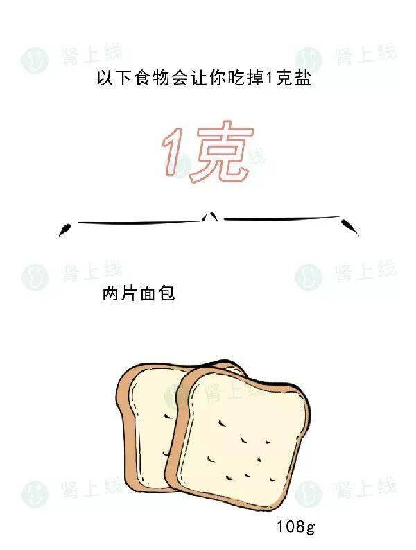 比如仅仅两片面包、一袋薯片、一小缕龙须面、两小把五香花生,就分别含1g盐,稍不注意盐就吃多了。